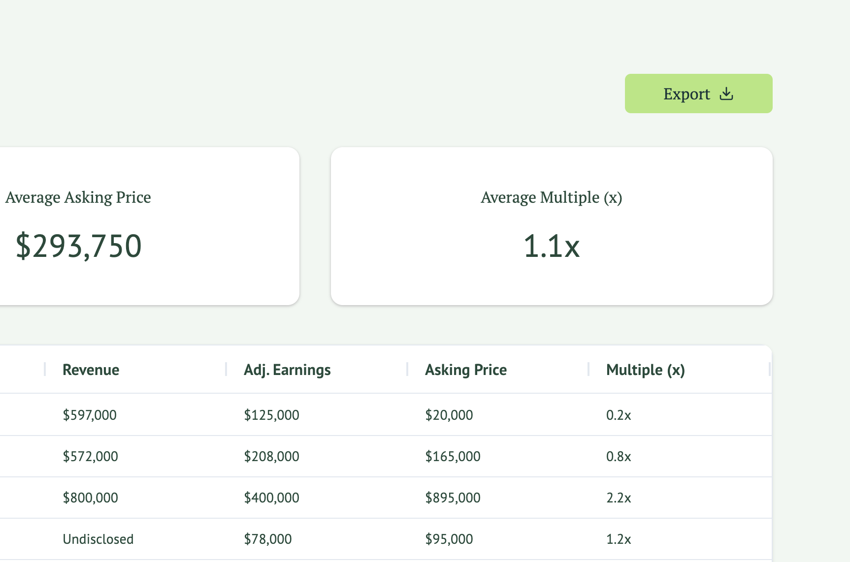 Because our data is drawn from thousands of live listings across every region and industry, you’ll get a reliable, market-based benchmark for your asking prices. Just be sure to explain to sellers that these multiples are pre-negotiation guides—not guaranteed sale results.